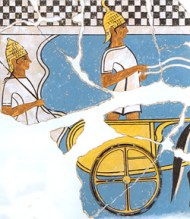 Two helmeted warriors and chariot on a Mycenaean fresco from Pylos, ca. 1350 BCE. Source: Wikimedia Commons