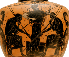 Achilles and Ajax playing a board game, depicted on the belly of an Attic black-figure hydria, ca. 510 BCE