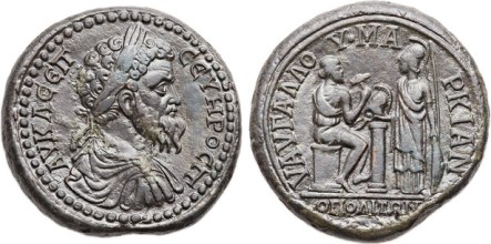 Caption: “MOESIA INFERIOR. Marcianopolis. Septimius Severus (AD 193-211). Æ 42mm medallion (52.54 gm, 2h). Aurelius Gallus, magistrate. ΑV K Λ CEΠ CЄVΗΡΟC Π, laureate, draped, and cuirassed bust of Severus right / V AV ΓAΛΛΟ • MA-PKIAN, Hephaestus seated to right on cippus, applying hammer to a crested Corinthian (for Achilles) helmet set on low column, faced by Athena, standing left and holding spear and shield; in exergue, OΠOΛΙΤΩΝ. Varbanov -. AMNG -. BMC -. Apparently unrecorded (Ancient Coinage Author’s collection)”