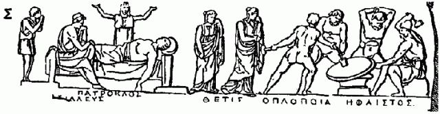 Σ (1) line 233, Ἀχιλλεύς, Πάτροκλος. Achilles seated at the foot of the bier weeps over Patroclus ; a boy (Automedon) and a maid join in the lamentation. (2) line 367; Θέτις. Thetis and one of her attendant nymphs on their way to Hephaestus. (3) line 478, Ὁπλοποία, Ἥφαιστος. Hephaestus and three Cyclopes forge the shield. Line drawing detail from the Capitoline Tabula Iliaca, ca. 15 BCE