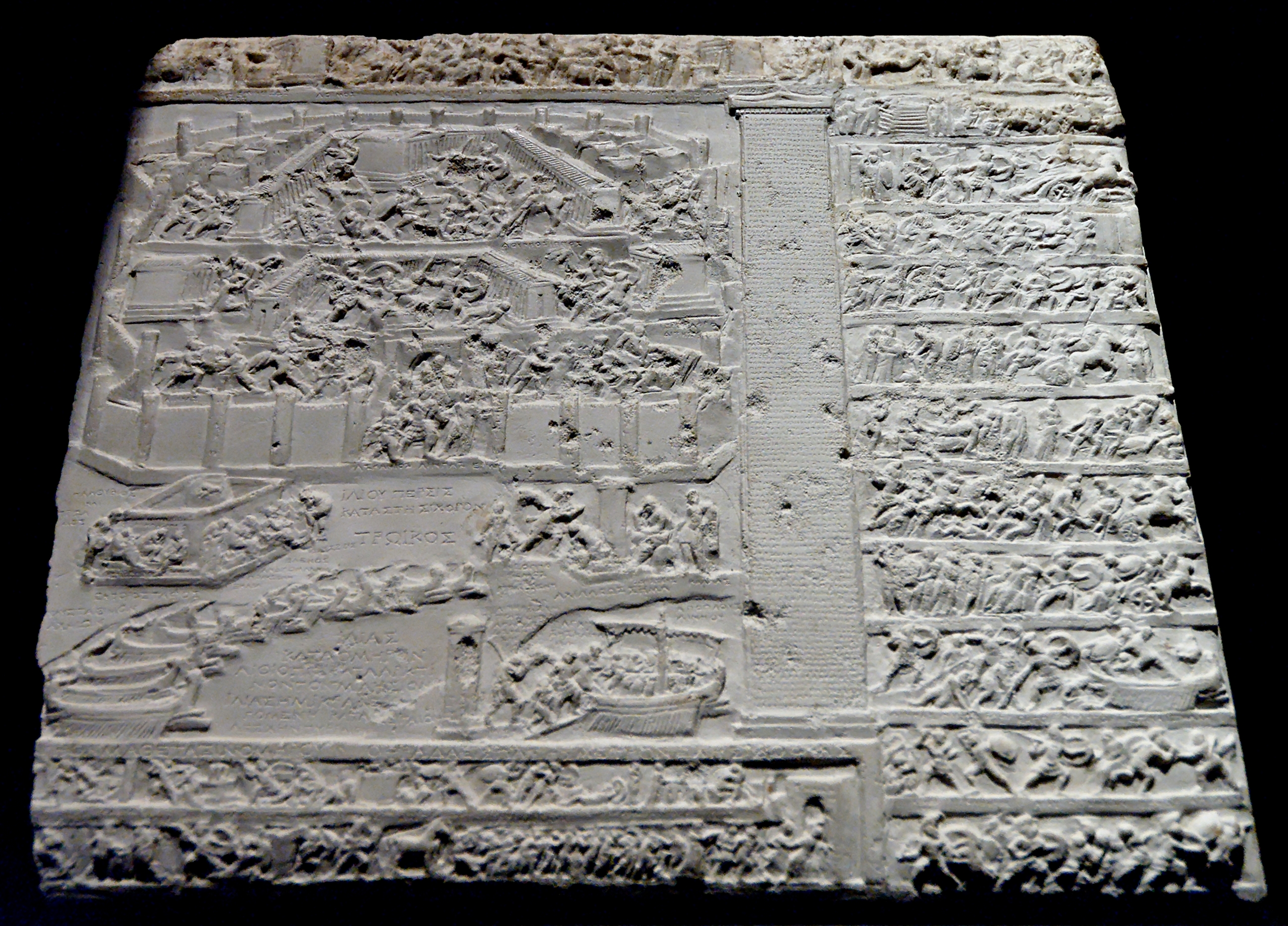 Carved and captioned scenes from the Trojan War on a tablet known as the Capitoline Tabula Iliaca, ca. 15 BCE, now in the Capitoline Museum in Rome.