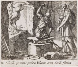 Vulcan creating Achilles armor for Thetis etching ca 1606 by Antonio Tempesta depicted in an illustrated copy of Ovid’s Metamorphoses.