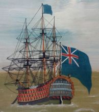 HMS Victory, flying the Blue Ensign (with the pre-1801 Union Jack), from The Fleet Offshore, 1780–90, an anonymous piece of folk art now at Compton Verney Art Gallery. Source: [CCSA 3.0] Neddyseagoon via Wikimedia Commons https://en.wikipedia.org/wiki/HMS_Victory#/media/File:HMSVictoryFromTheFleetOffshore.jpg