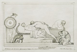 Thetis Delivers New Armor to Grieving Achilles. Copper engraving (1795) by Tommaso Piroli (1752 – 1824) after a drawing (1793) by John Flaxman (1755 – 1826).