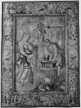 Vulcan hammering helmet (R of center, foreground); Thetis stands before Vulcan, pile of armor on ground next to her (L of center, foreground); fire of forge (R, background); landscape with ruins of buildings (L, background)