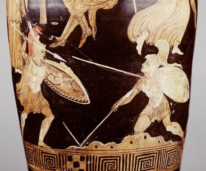 The Stadhoudersvaas, an Apulian red-figure neck amphora depicting Achilles battling with Memnon. The artwork is attributed to the Ixion painter, who probably worked in Capua between 330 and 320 BCE. Source: Free download from the Rijksmuseum van Oudheden via rmo.nl