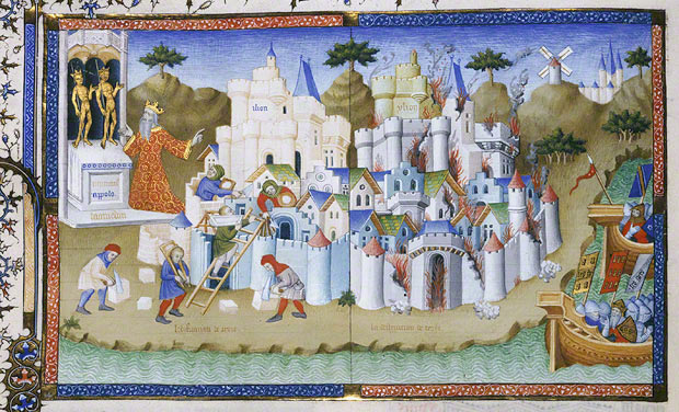 The Construction and Destruction of Troy, Orosius Master, Paris, ca. 1405–6. In City of God (Cité de Dieu; original text in Latin) folio 66; Saint Augustine, author; Raoul de Presles, translator. CC0 via Wikimedia Commons.