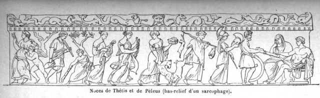 The wedding of Thetis and Peleus, sarcophagus from Villa Albani, Rome, illustration from Histoire des grecs, volume 1, Formation du peuple grec, 1886, CC0 via Wikimedia Commons