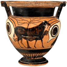 Attic Black-Figure Column Krater, ca. second half of 6th century BCE depicting Odysseus escaping Polyphemos the Cyclops by tying himself to the belly of a ram.