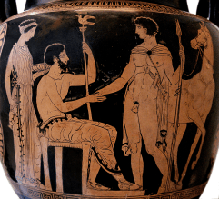 Apulian Red-Figured Volute-Krater ca. 410–400 BCE by the Sisyphus Painter depicting the arrival of a young warrior or hero. Alternatively, it could be a departure. It is considered to be possibly Theseus arriving at Athens and being recognized because of his sword by Aegeus. I would also submit its likelihood as either the arrival of Telemachus or Paris to the home of Menelaus and Helen. If you enlarge the image and note the eye contact between the beautiful woman and the handsome young man, you’ll likely agree that it’s Paris before he kidnaps Helen to Troy!