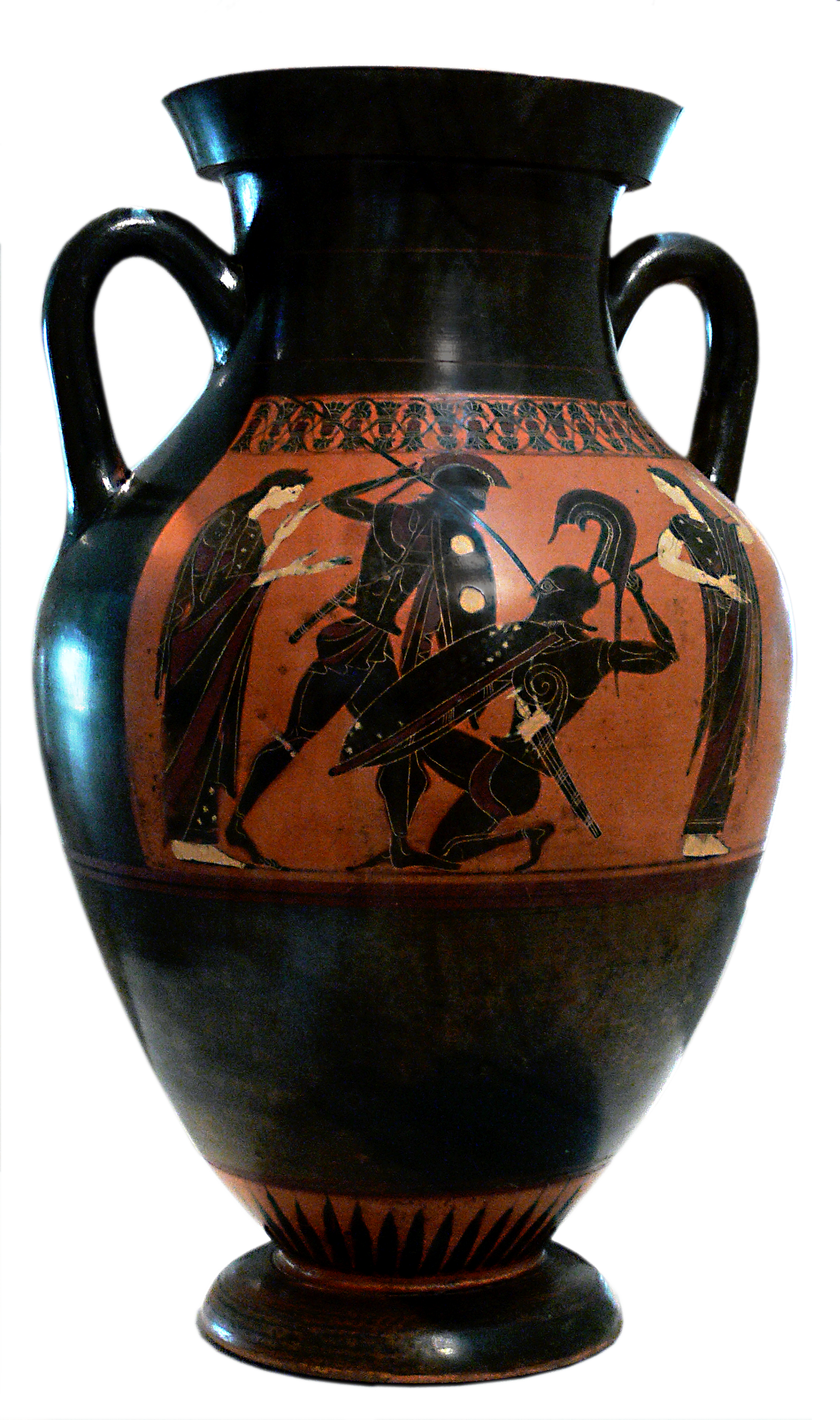 Attic Black-figure Amphora ca. 585 BCE by unidentified painter depicting two warriors in battle, possibly Achilles and Hektor, with the mother of each, Thetis and Hecuba in this case, to left and right of the warriors.