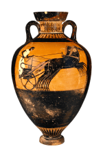 Attic Black-figure Amphora ca. 490-480 BCE by the Kleophrades Painter depicting the 4-horse chariot racing competition. Typically filled with olive oil, this type of trophy was awarded to chariot race winners at the Panathenaic Games in Athens.