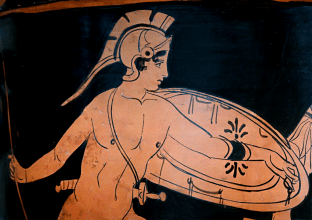 Detail View of Achilles on a Lucanian Red-Figure Bell-Krater, ca. 5th century BCE depicting the battle of Achilles and Penthesileia.