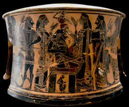 Attic Black-Figure Exaleiptron (tripod), ca. 570–560 BCE by the C Painter depicting the moment when Athena springs fully grown from the head of Zeus. Hephaistos, on the left, is identifiable by his double-edged axe. On the right, Poseidon is identifiable by his trident.