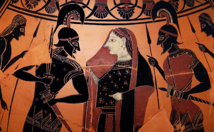 Telemakos, arriving with Nestor’s son by chariot to the palace of Helen and Menelaus, hopes to hear news of his father, Odysseus. It is evening and the palace is brightly lit and buzzing with guests, festivities, and excitement. Hermione, the only daughter of Helen and Menelaos, is enjoying a marriage feast in her honor before being sent off to marry Neoptolemos, the heroic son of Achilles.
