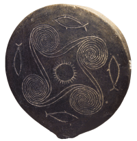 This flat, round-shaped object is etched with a symbol of the sun in the center, encircled by a connected series of four equally spaced spirals representing the ocean. This ocean motif is easily interpreted by the presence of four “alpha”-shaped symbols representing fish spaced uniformly between the four connected wave spirals.
