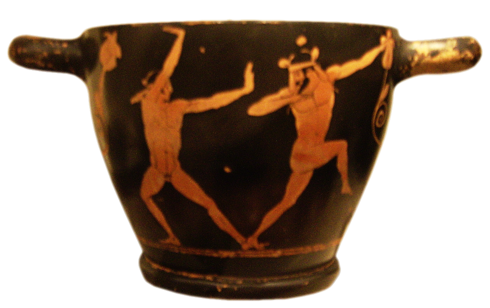 Attic Red-Figure Skyphos, ca. 470 – 460 BCE depicting two young men performing acrobatic stunts at a symposium.