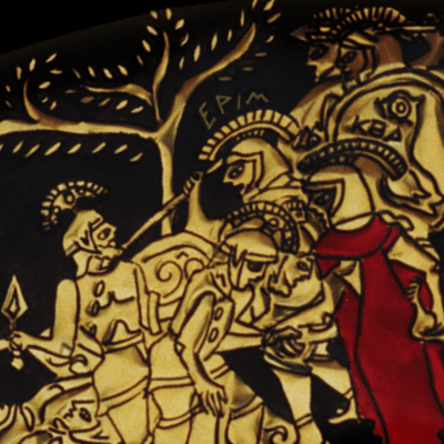 “Upon the riverbanks fighting began as foes threw spears at each other. Then Strife and Tumult entered the skirmish, together with terrible Fate, who kept barely living a man with wounds, and preserved another unwounded …” —Continue Reading